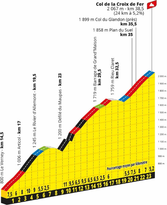 En effet, le col de la Croix de Fer, et ses 24km à 5,2% de pente moyenne, se dressera devant vous. Derrière ce pourcentage moyen qui semble accessible se cache un monstre d’irrégularité. L’ascension comporte 2 redescentes (de 2 kilomètres chacune) qui font grandement chuter le pourcentage moyen.