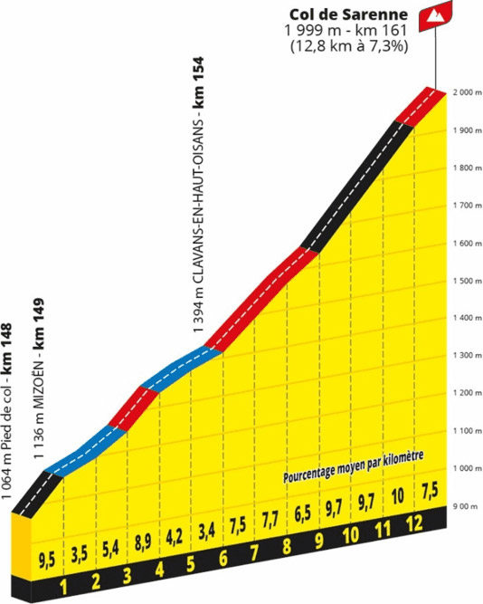 Un juge de paix qui s’avère être le col de Sarenne, une variante pour monter jusqu’à la station de l’Alpe d’Huez. Au programme, 12,8km à 7,3% de moyenne. Même si elle est plus courte que les cols empruntés précédemment, cette montée est redoutable pour deux raisons : Elle intervient après 148 km et vos réserves seront grandement entamée à son approche. Elle comporte aussi des pourcentages élevés (supérieurs à 9%) au pied et dans les 4 derniers kilomètres.