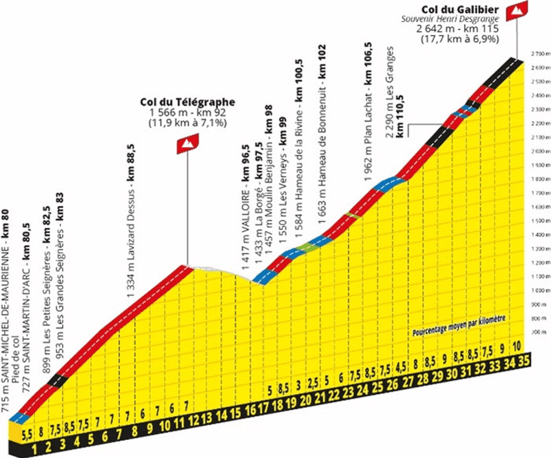 Après une courte descente vers le village station de Valloire, vous enchainerez avec le mythique col du Galibier. Un géant qui culmine à 2642m d’altitude. Si le pourcentage moyen est de 6,9% sur 17,7km, on peut découper cette ascension en deux parties :